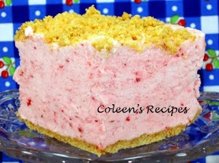The strawberry mousse filling sits on a shortbread cookie crust and the whole thing is frozen and ready for company at a moments notice.